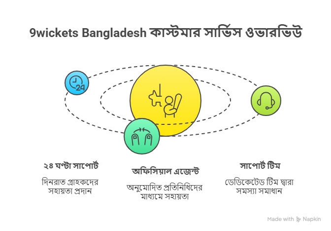 নাইন উইকেট Bangladesh ২৪ ঘণ্টা কাস্টমার সার্ভিস প্রদান করে। ব্যবহারকারীরা অফিসিয়াল এজেন্ট বা সাপোর্ট টিমের মাধ্যমে দ্রুত সমস্যার সমাধান পেতে পারেন।